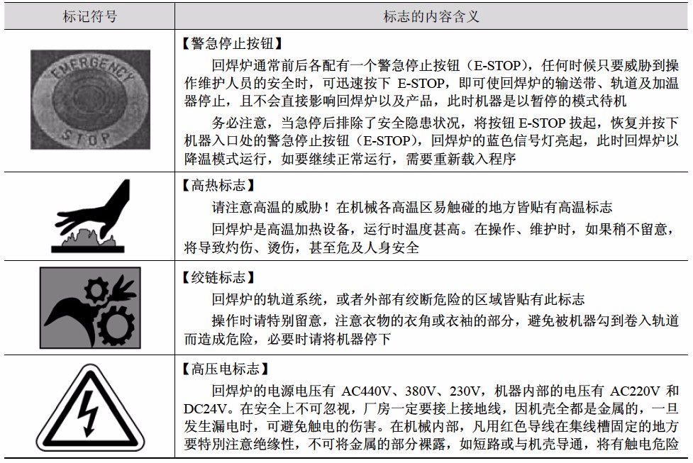 回流焊是 SMT 生產(chǎn)過(guò)程中的關(guān)鍵工序,焊接的質(zhì)量直接影響電子產(chǎn)品的電氣性能和連接的可靠性。準(zhǔn)確、高效的維護(hù)操作,可有效地改善設(shè)備的缺陷,以獲取最大的效益產(chǎn)出,有效地提高生產(chǎn)效率和生產(chǎn)質(zhì)量。操作維護(hù)人員必須經(jīng)過(guò)專業(yè)學(xué)習(xí),持證上崗。為了人身和設(shè)備的安全,必須嚴(yán)格執(zhí)行安全技術(shù)操作規(guī)程。其安全標(biāo)志和安全信息見(jiàn)表1-2-7。