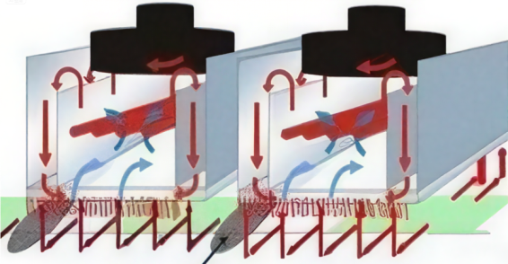 風葉熱風加熱結構的穿透力不足,而風輪增壓式熱風結構正是為解決這個問題誕生的,回流焊增壓熱風結構的核心原理是通過強制高壓氣流穿透高元件陰影區(qū),解決傳統(tǒng)熱風爐的熱傳遞不均勻問題。
