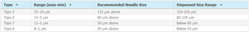u 針頭內(nèi)徑至少是焊料顆粒大小的五倍才能有效避免出現(xiàn)堵塞問題。常見的錫膏顆粒大小和針頭大小關(guān)系如下: