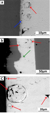 圖2. 電阻器J1 (a, b)和J3 (右) 的焊點(diǎn)SEM圖。