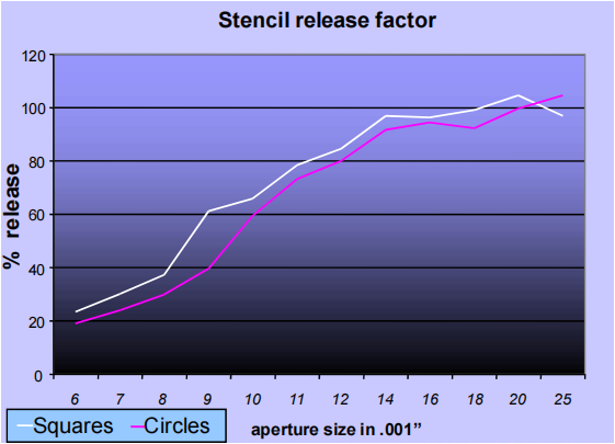 測試數(shù)據(jù)表明,對(duì)于小孔徑,方形孔表現(xiàn)要比圓形孔要好,如下圖所示(結(jié)果來自于一個(gè)0.005”的電鑄鋼網(wǎng))