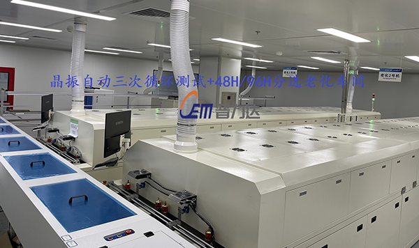 下圖為惠倫晶體重慶分公司自動(dòng)測試+老化線,實(shí)際模擬晶振產(chǎn)品在經(jīng)過自動(dòng)上板進(jìn)入三次回流焊烘烤后產(chǎn)品是否存在可靠性問題,并經(jīng)由視覺掃碼分選進(jìn)入后端48H和96H老化爐,出口自動(dòng)收板,達(dá)到客戶晶振每月產(chǎn)能60000K(拍攝照片經(jīng)由客戶同意)