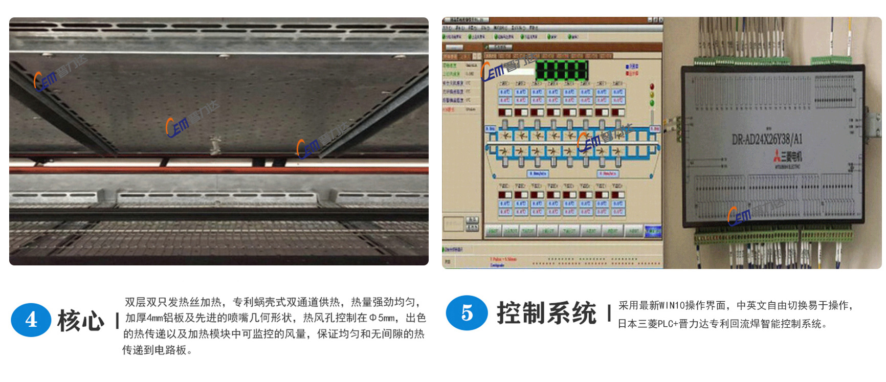 2、采用瑞士CARLO(佳樂(lè))大電流固態(tài)繼電器無(wú)觸點(diǎn)輸出,安全、可靠,結(jié)合溫控器特有的模糊控制功能,一直監(jiān)視外界溫度及熱量值的變化,以低脈沖控制發(fā)熱器件,快速作出反應(yīng),保證溫控精度±1℃,機(jī)內(nèi)溫度分布誤差在±2℃以內(nèi),長(zhǎng)度方向溫度分布符合IPC標(biāo)準(zhǔn)