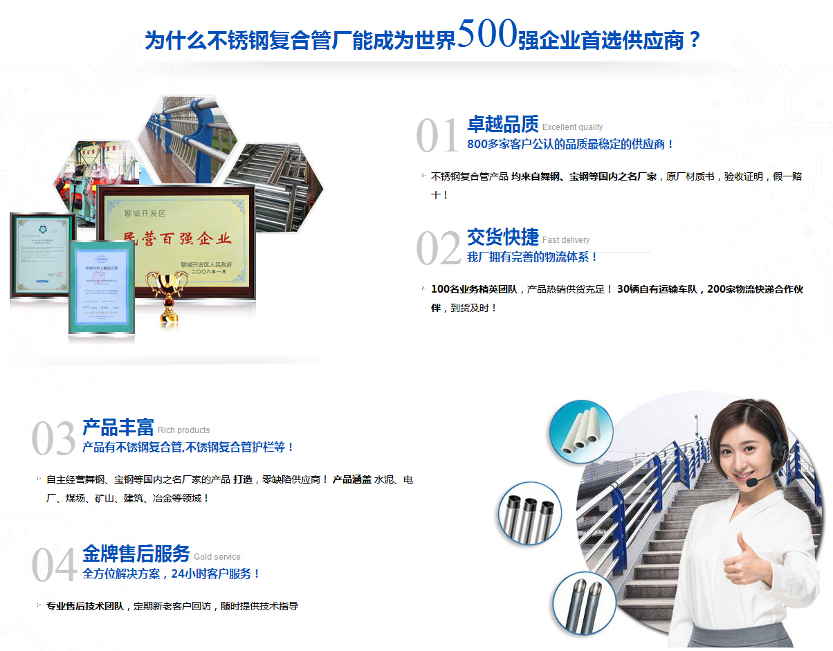 公司全體員工自2003年從事工程制作、施工以來,積累了許多施工技術(shù)和經(jīng)驗(yàn),能在短期內(nèi),高質(zhì)、高效的完成各種工程,公司現(xiàn)引進(jìn)國際先進(jìn)項(xiàng)目管理體制和市場(chǎng)研發(fā)應(yīng)用能力,從事專業(yè)不銹鋼/碳素鋼復(fù)合管大型道橋欄桿設(shè)計(jì)、生產(chǎn)、制作、安裝。 不銹鋼復(fù)合管是由不銹鋼管與碳素鋼管復(fù)合而成的,技術(shù)含量高,設(shè)備精密,工藝先進(jìn)產(chǎn)品質(zhì)量穩(wěn)定,采用電腦自動(dòng)控制。產(chǎn)品具有純不銹鋼外表豪華、美觀和普通碳素鋼管強(qiáng)度高的特點(diǎn),其價(jià)格低于純不銹鋼管,是價(jià)昂不銹鋼結(jié)構(gòu)裝飾管材的替代產(chǎn)品。產(chǎn)品廣泛用于市政公用工程施工,鋼結(jié)構(gòu)、網(wǎng)架工程施工,石油石化、市政設(shè)施、路橋護(hù)欄、公路交通工程施工;建筑裝飾工程施工;體育場(chǎng)地設(shè)施工程施工交通格柵、鐵路隔離網(wǎng)、建筑裝飾、路燈、站牌、鋼結(jié)構(gòu)網(wǎng)架、家具、車船制造、城市管網(wǎng)、輸油輸氣、摩托車保險(xiǎn)杠、晾衣架、自行車車把等;產(chǎn)品規(guī)格φ9.5mm—φ219mm,壁厚0.5mm—18.0mm,表面光亮…
